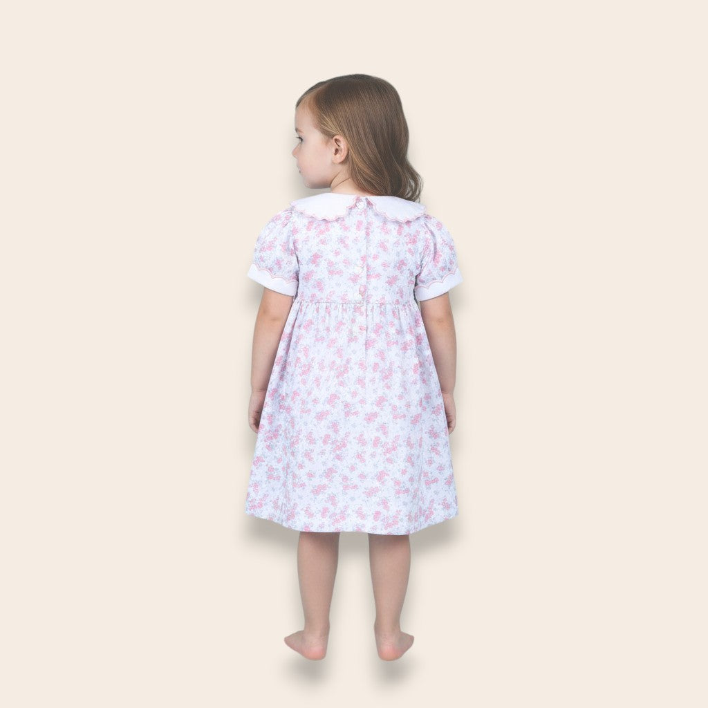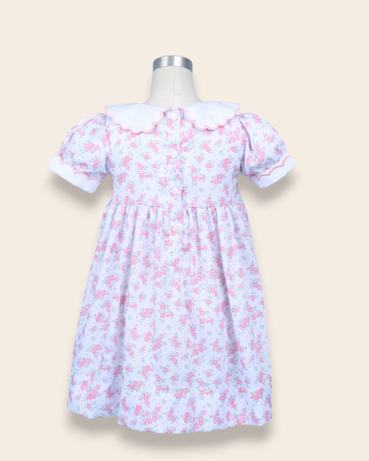 Delicate and timeless, the Albani Pink Floral Dress features a soft pink base adorned with tiny floral details and elegant white buttons at the chest. Hand-embroidered accents add a special touch of craftsmanship, making this a truly heirloom-worthy piece.